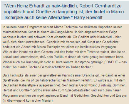 das war ein gelungener Abend ! Marco Tschirpke verstand es “meisterlich” sein Publikum zu begeistern.Ein junger Künstler, von dem man sicher noch hören wird.Alle, die an diesem Abend im Zuschauerraum saßenwaren sich einig ... das hat sich gelohnt!Der Mut, eine Karte für eine Veranstaltungzu kaufen, wo ein Künstler auftritt, den fast Niemandim Bekanntenkreis kannte - wurde belohnt